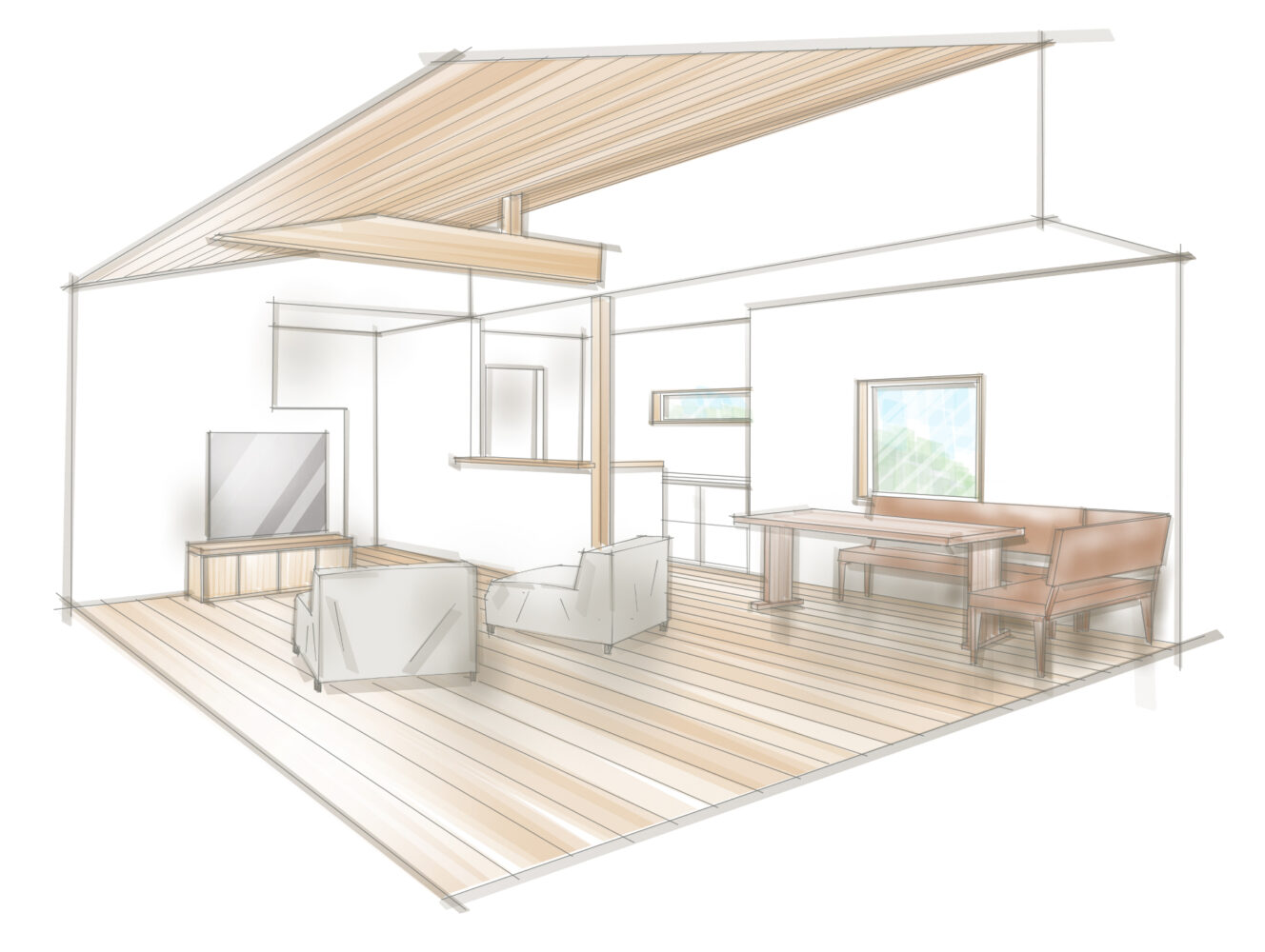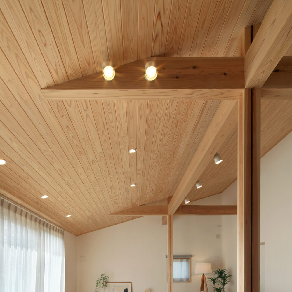 木組みの梁が印象的なリビングは、天井が高く開放的。自然素材のぬくもりに包まれながら家族がゆったりくつろげます。