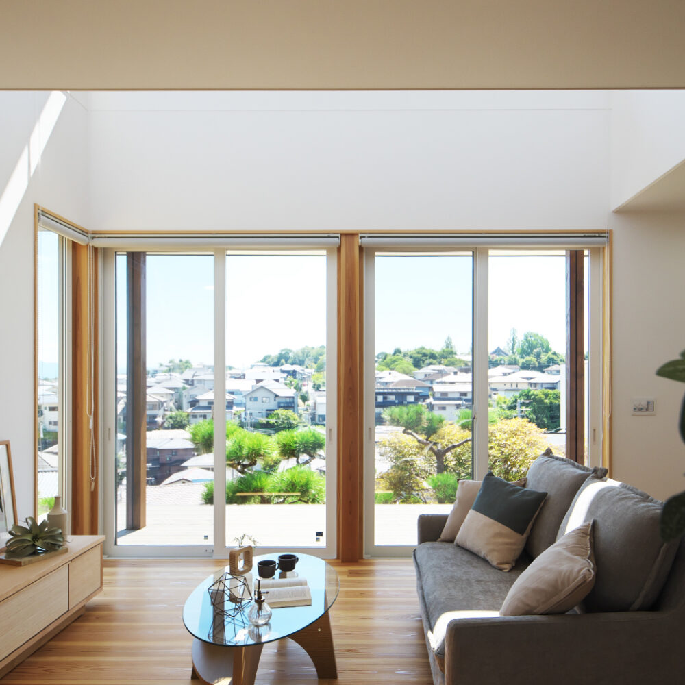 山あいの豊かな緑を借景に、リビングでくつろぎながら四季折々の自然を満喫できるお家です。