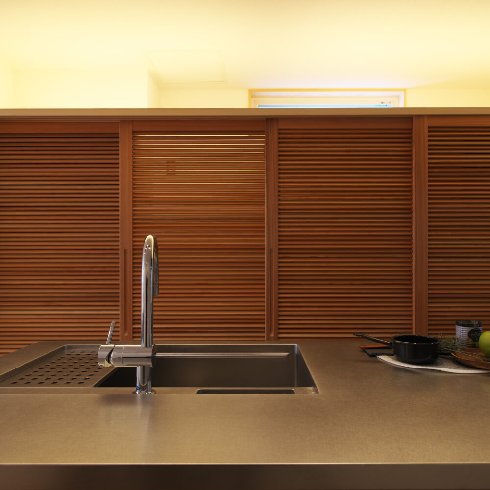 キッチン背面には扉で隠せる収納を備え、家電やストック品を見せずに整えられる暮らしやすさを実現。