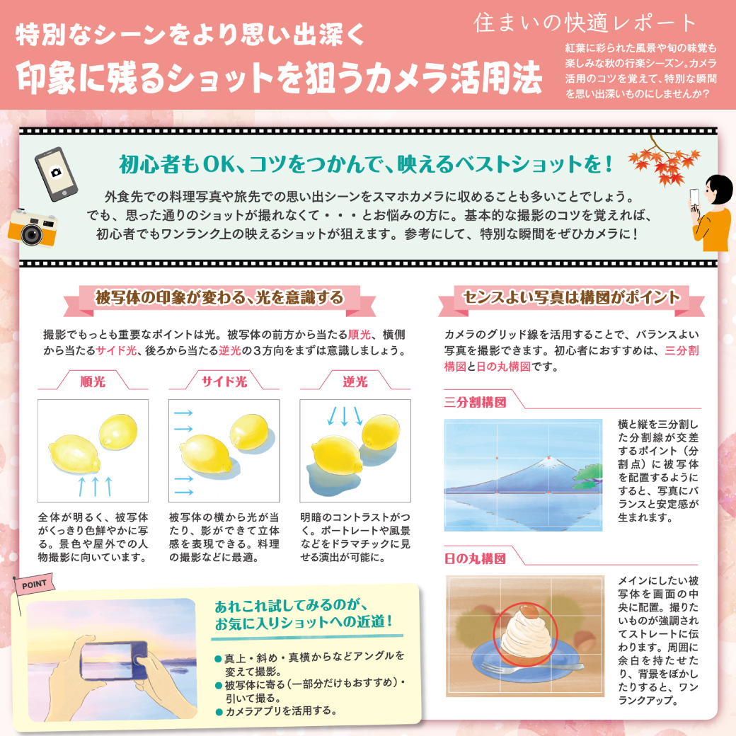 〈住まいの快適レポート〉印象に残るショットを狙うカメラ活用法 お知らせ 2025/09/22 厳しい夏が過ぎ、行楽シーズン到来!せっかくの特別な瞬間、スマホカメラのコツを覚えてベストショットをおさめてみませんか?