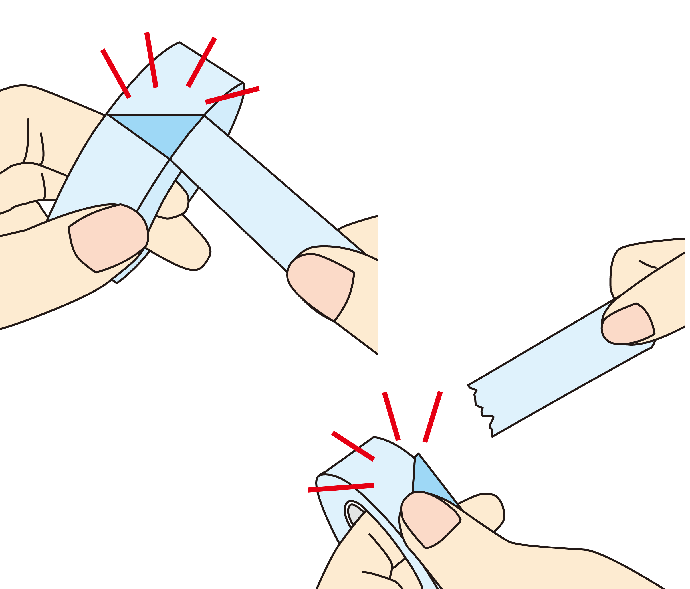 テープを使用したい長さまで引き出し、カットしたい部分を粘着同士を合わせるように90度に折り曲げます。2枚の合わさったテープの縁が刃のような役割に。カットしたいテープ部分を下に引っ張るようにすると、切り口が比較的キレイにカットできます。
