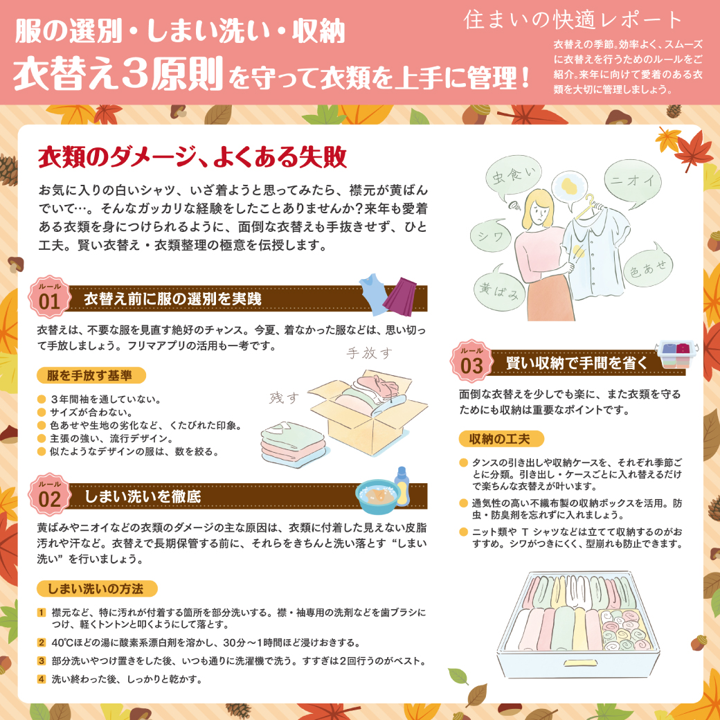 〈住まいの快適レポート〉衣替えの3原則を守って衣類を上手に管理! お知らせ 2025/10/20 季節が移ろう今こそ、気持ちも暮らしも新しく整えたいとき。効率よく、ストレスなく衣替えを進めるためのルールをご紹介します♪
