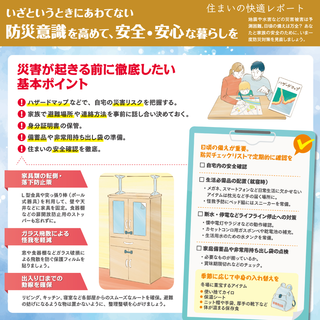 〈住まいの快適レポート〉防災意識を高めて、安全・安心な暮らしを お知らせ 2025/11/25 予測困難な、地震や水害の被害。あなたの日頃の備えは万全でしょうか? いま一度、あらためて防災対策を見直しましょう!