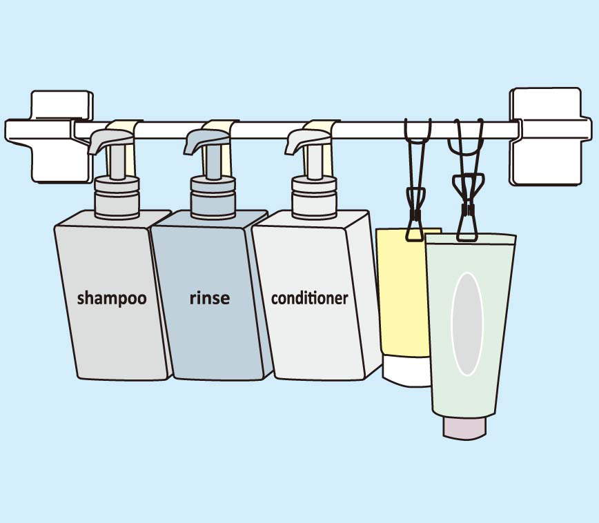 普段使いのシャンプーやコンディショナー、石けんなどを浮かせて収納したい場合は、さびにくいステンレスのカゴに入れ、S字フックでタオル掛けに掛ければ気軽にできます。また、シャンプーボトルに装着してタオル掛けに吊り下げられるフックを使うのもおすすめです。