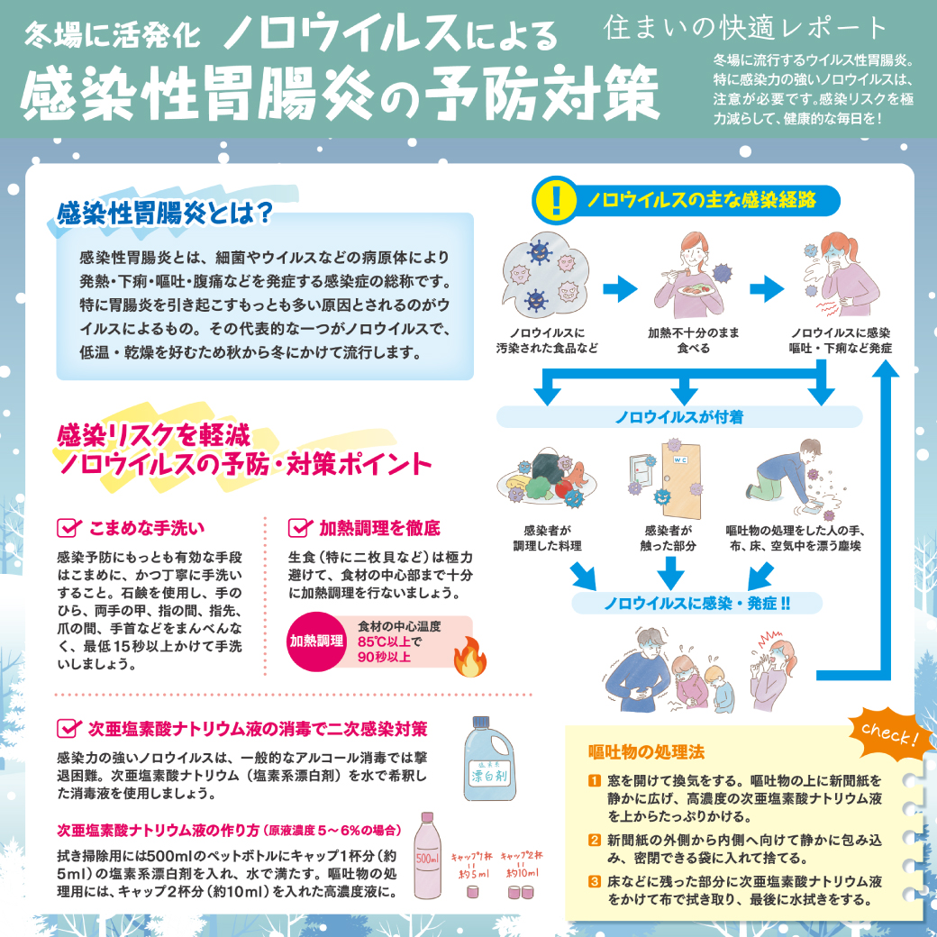 〈住まいの快適レポート〉感染性胃腸炎の予防対策 お知らせ 2026/01/26 冬場に流行するのが怖いのが、ウイルス性胃腸炎をはじめとする感染症です。特にノロウイルスは感染力が強く、注意が必要。そんなウイルス感染を避けて、健康的な毎日を送りましょう!