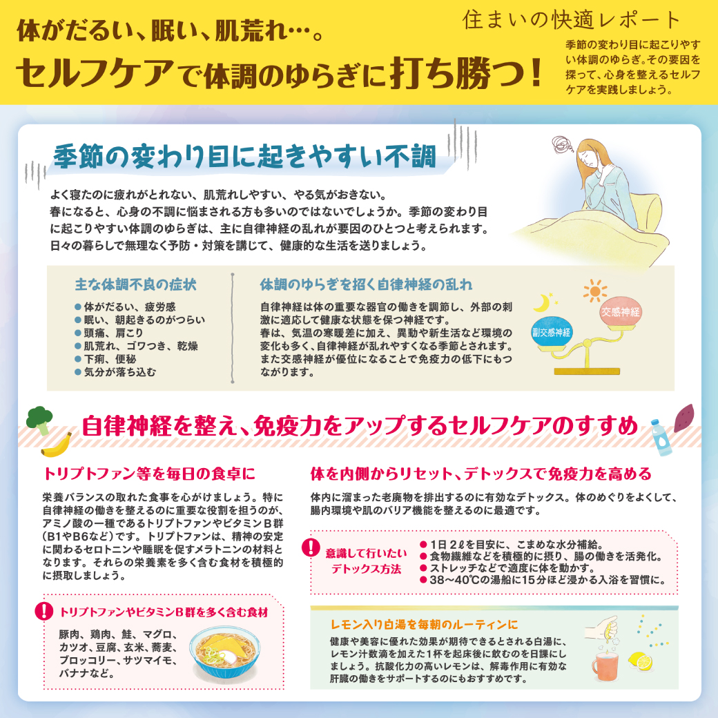 〈住まいの快適レポート〉セルフケアで体調のゆらぎに打ち勝つ! お知らせ 2026/03/30 今のような季節の変わり目に起こしやすいもの、それは体調のゆらぎです。今回はその原因を探り、セルフケアを実践して心身を整えましょう♪