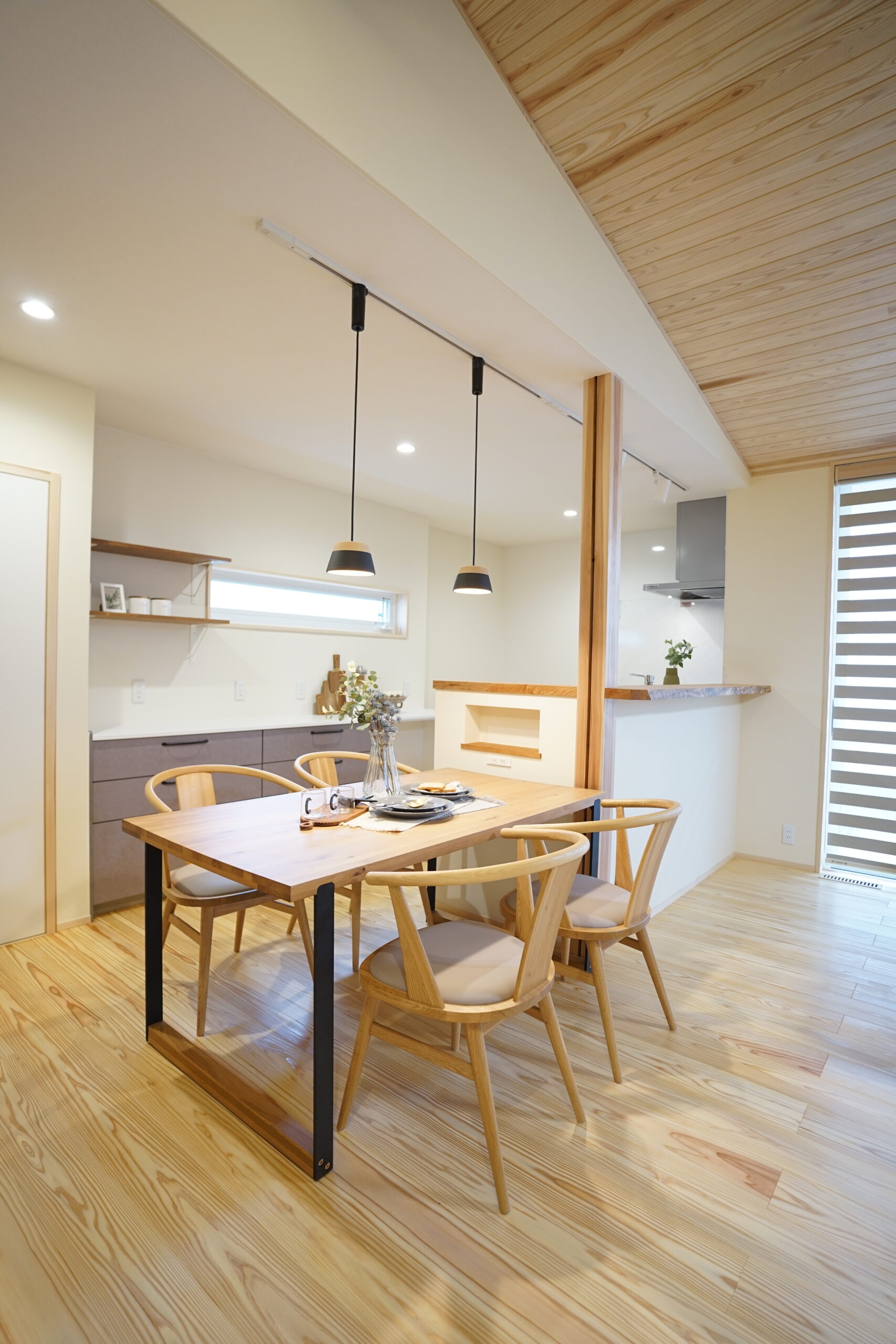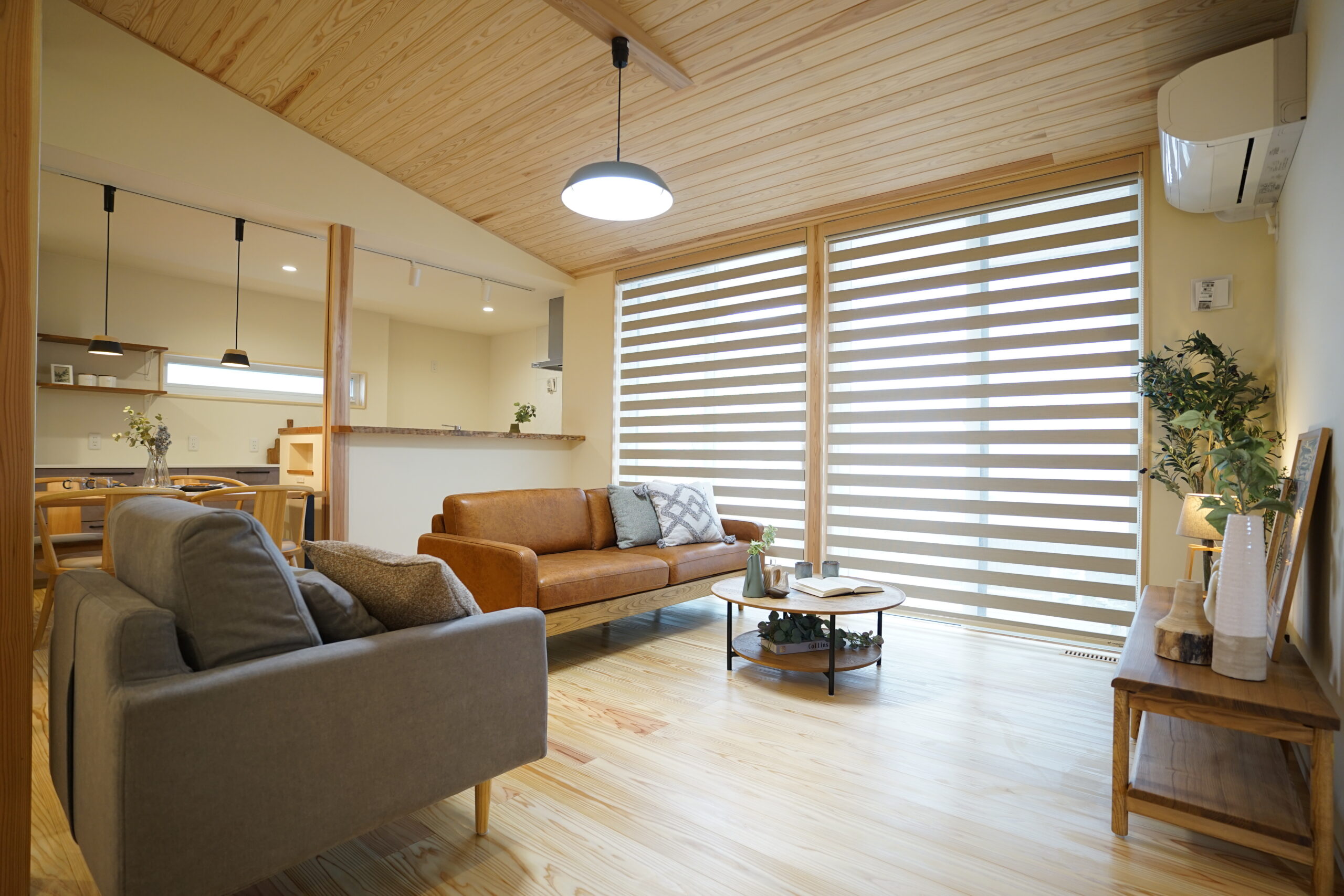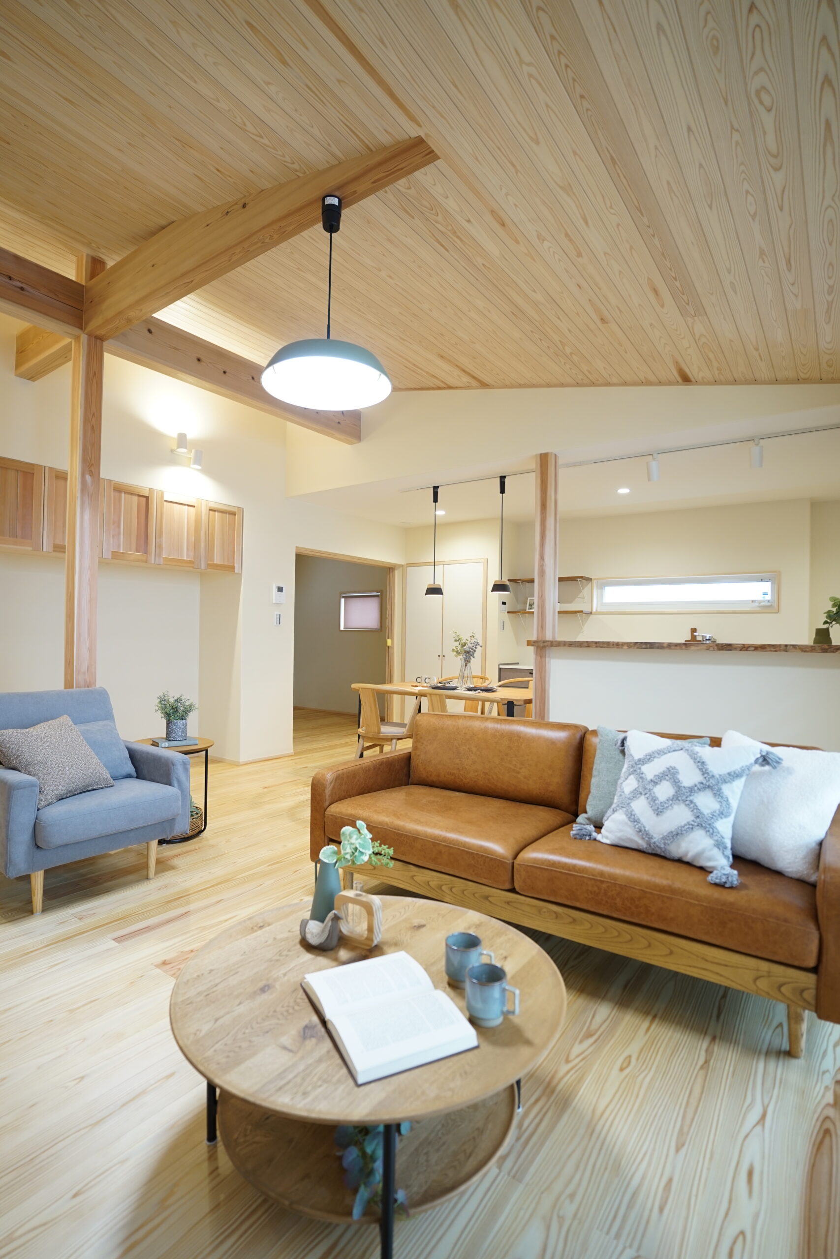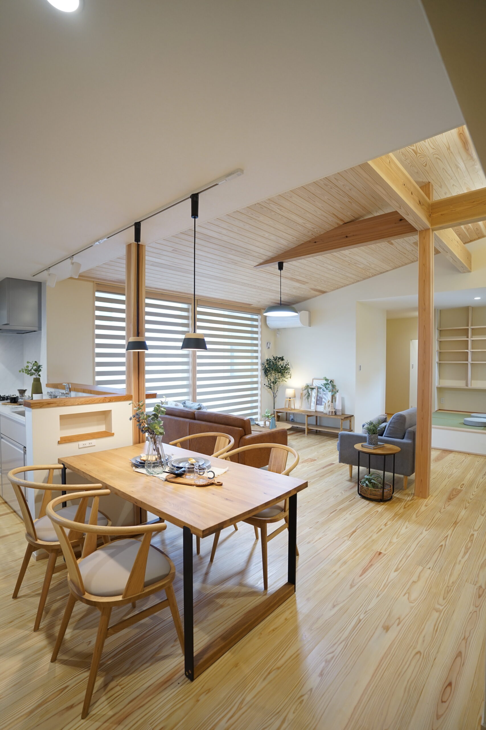 勾配天井が開放感をもたらし、無垢材のぬくもりに包まれながら過ごせます