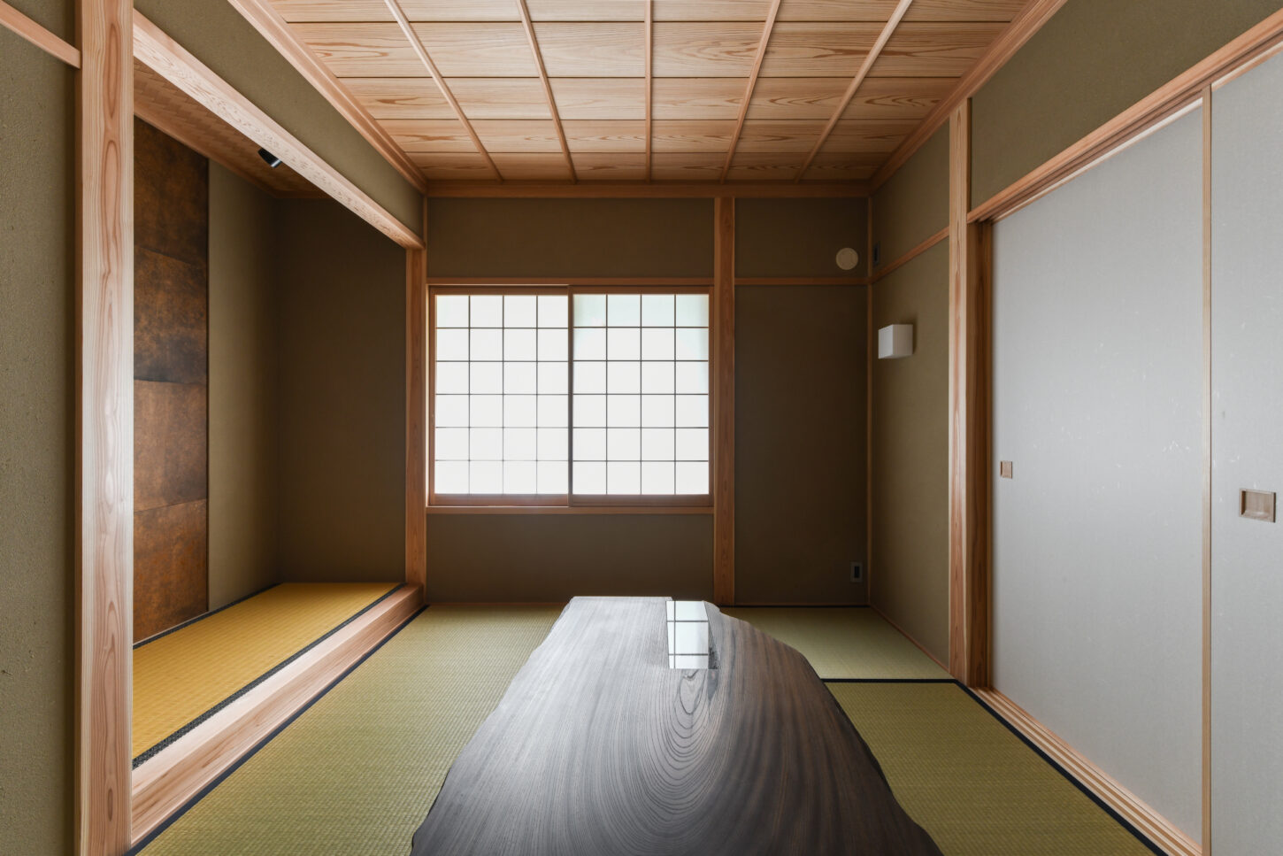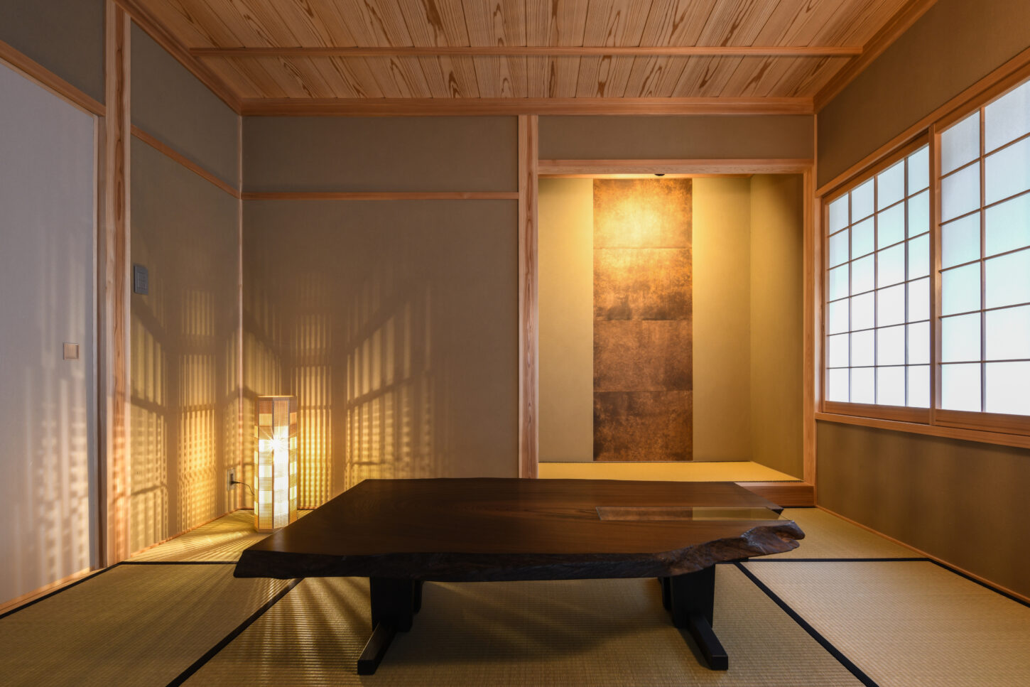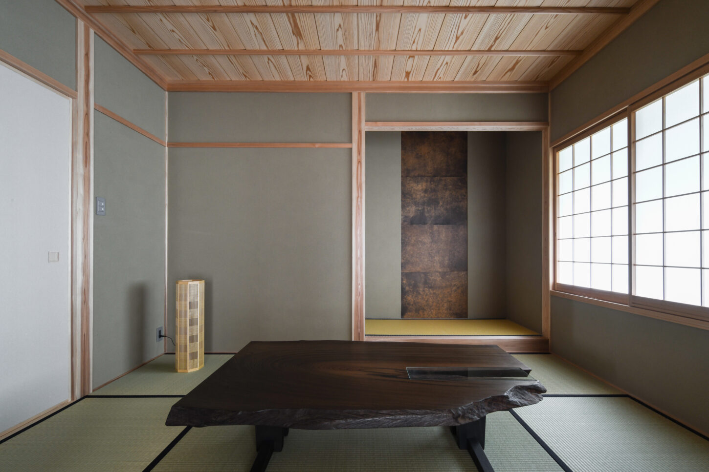 天井は、木目が美しい杉板を張り、温もりのある質感を加えています。右手の大きな障子窓からは、和紙を通して柔らかな自然の光が室内に静かに差し込んでいます。奥には床の間のような設えも見え、全体として洗練された趣と、心地よい静けさが感じられる上質な空間です。