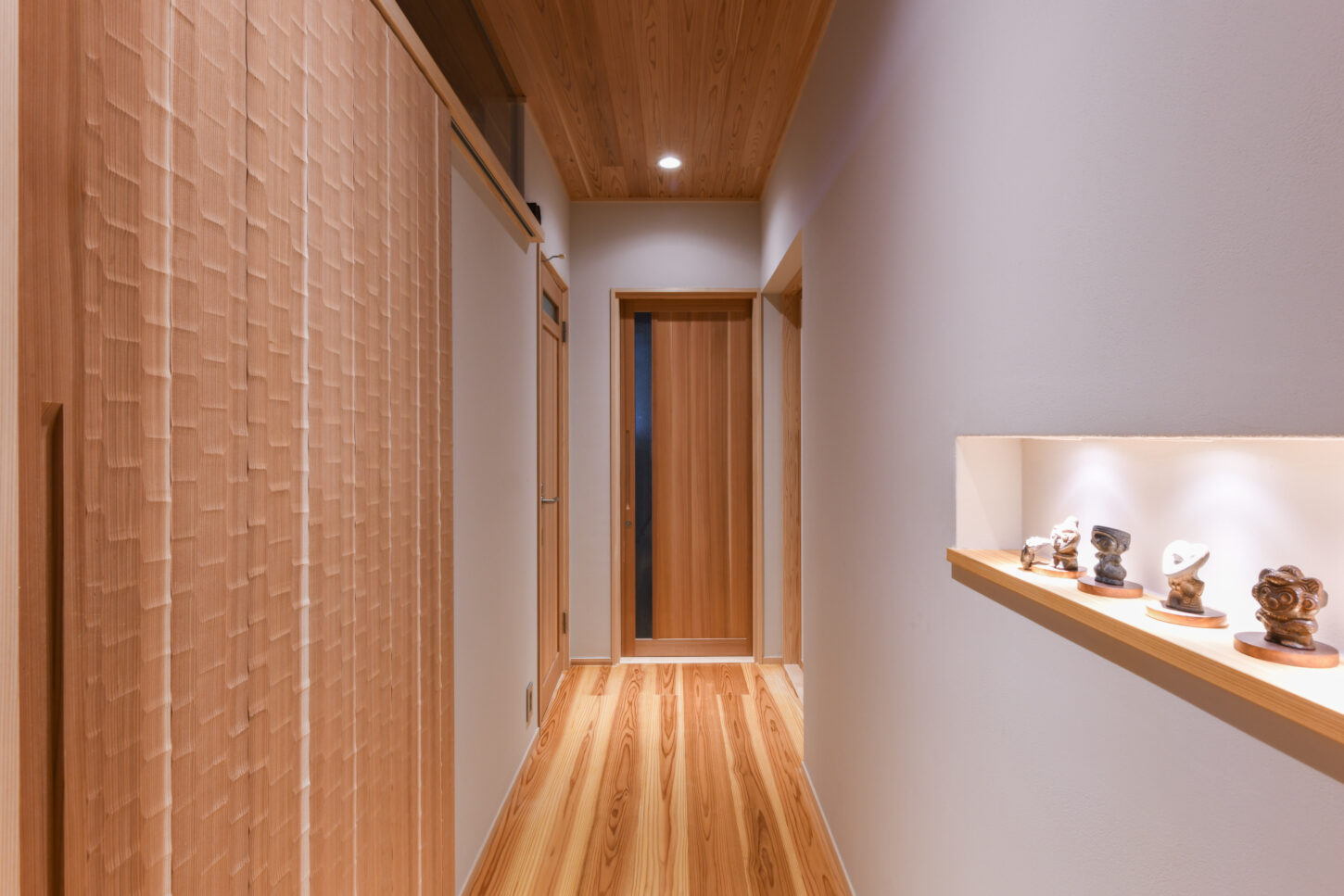 床や天井に吉野杉の板を張った廊下スペース。右側の壁には、小物を飾るためのニッチ(飾り棚)を設けています。上部からの照明によって飾られたオブジェが奥ゆかしく照らされ、空間に上質な趣を加えています。