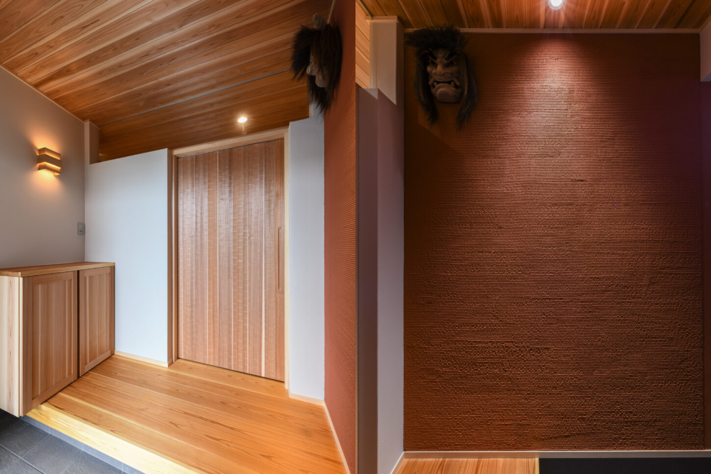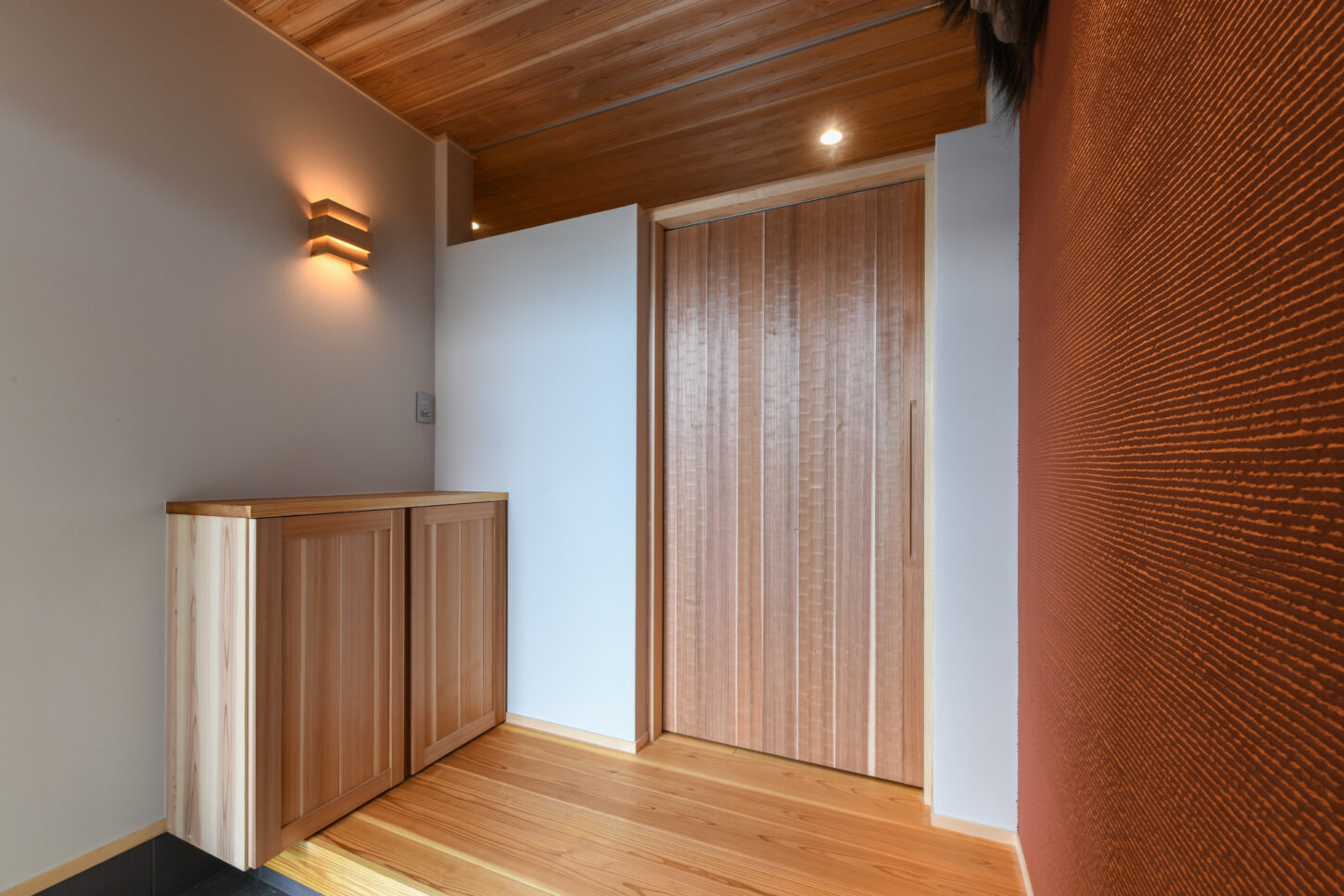 床と天井には吉野杉の板を張り、空間全体に温かさと上質感が演出しています。左手には、造作の下駄箱を設置し、壁に取り付けられた間接照明が温かい光を添えています。