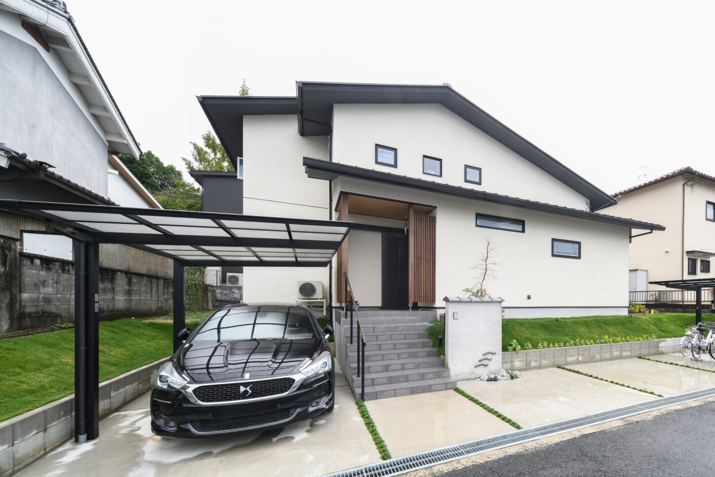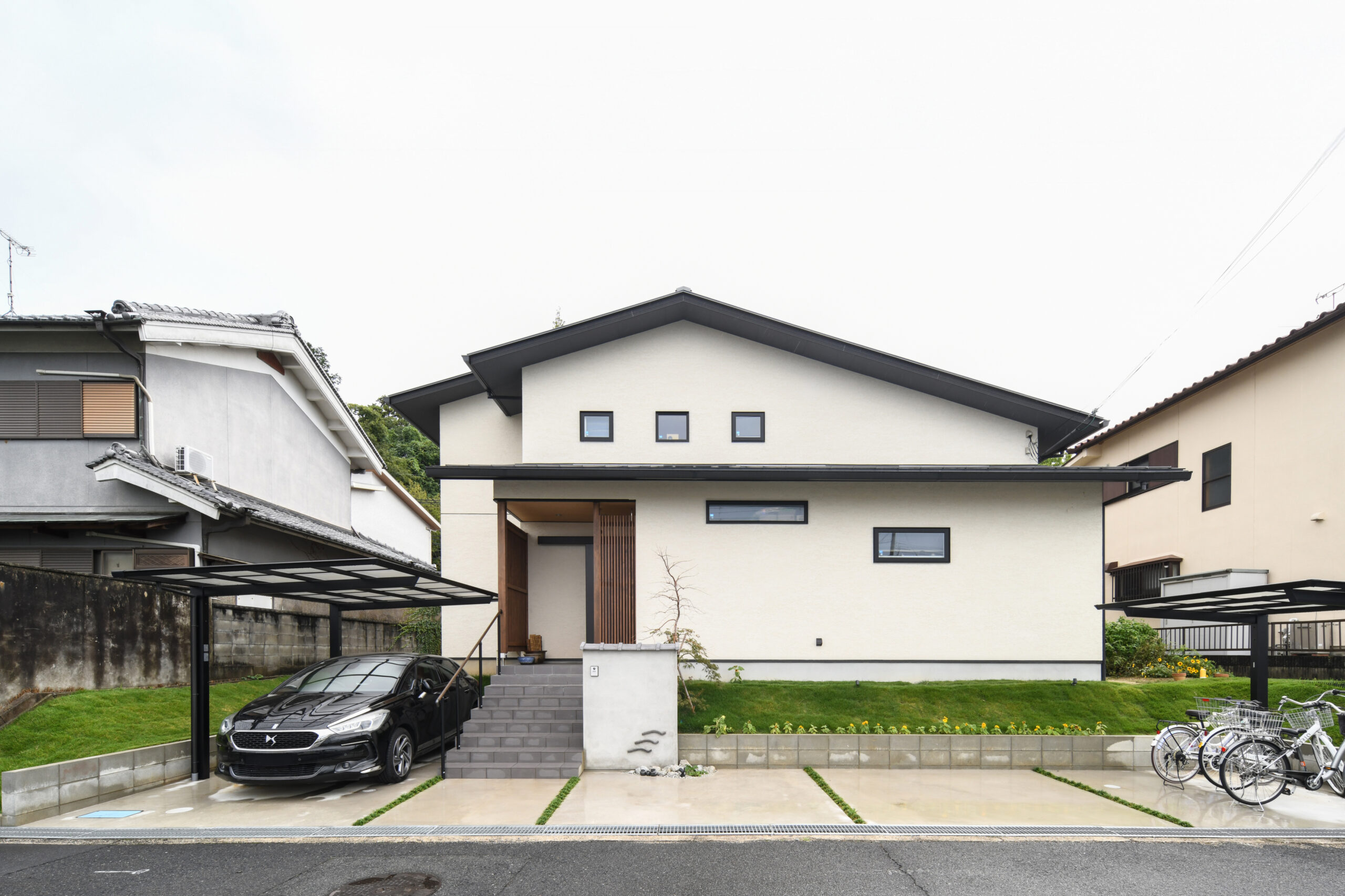 オフホワイトの塗り壁を基調とした落ち着いた外壁に、深く伸びる軒が印象的なシャープな切妻屋根が特徴。モダンな中に、どこか懐かしい日本の住まいの美しさを感じさせます。玄関ポーチには温かみのある木格子がアクセントになっています。
