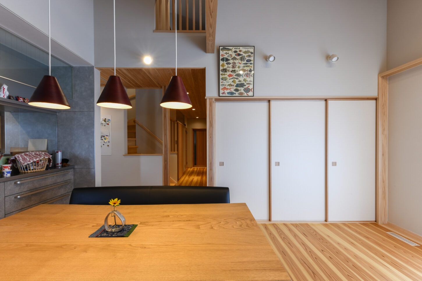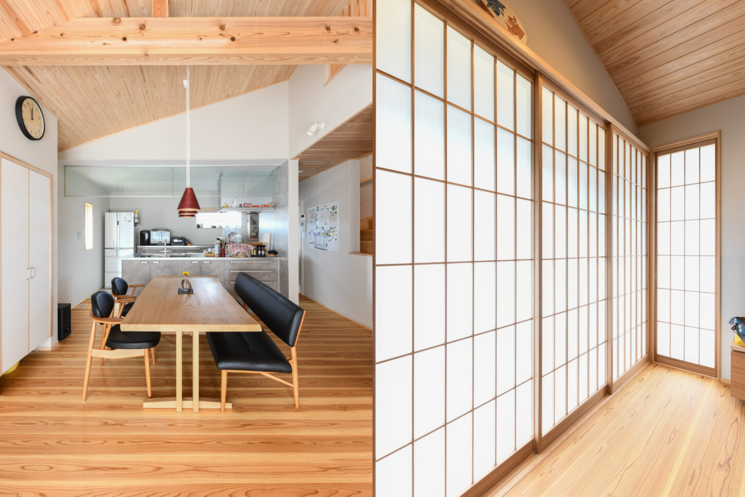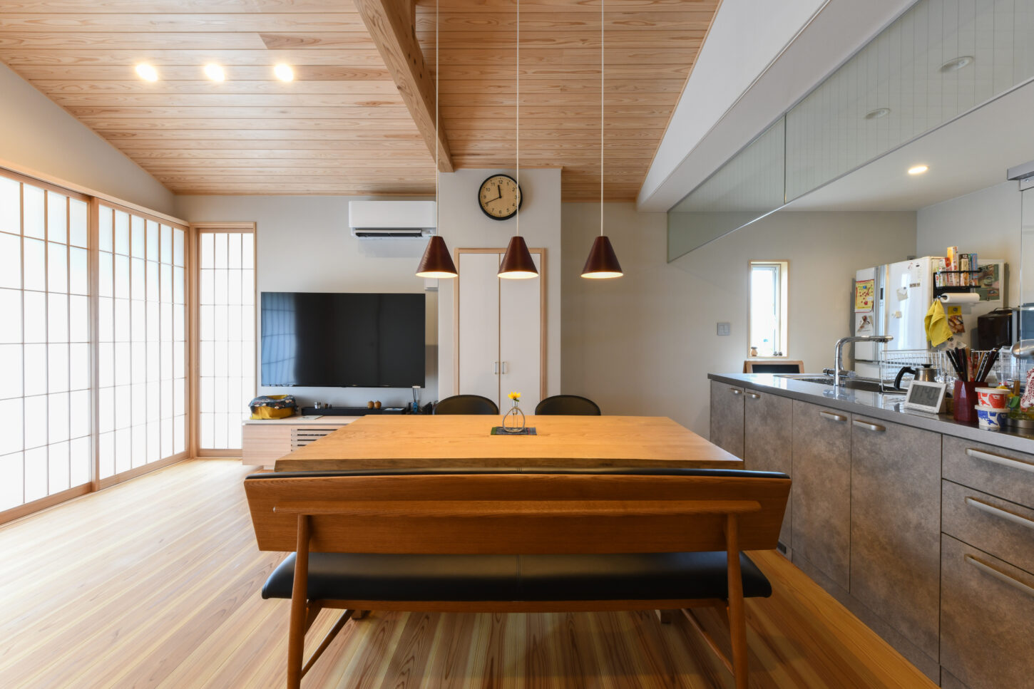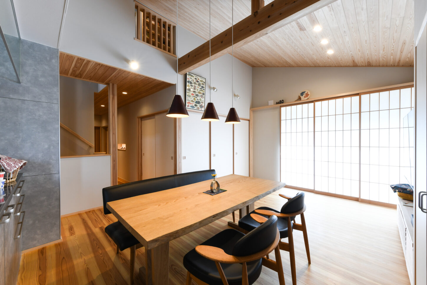 ダイニングには無垢板のテーブルとイスが配置され、上部にはモダンなペンダントライトがアクセントを添えています。左手には、大きな障子が窓からの光を均一に和らげ、和の静謐な趣を添えています。全体が温かい光と木材に包まれた、心地よく機能的な住空間です。