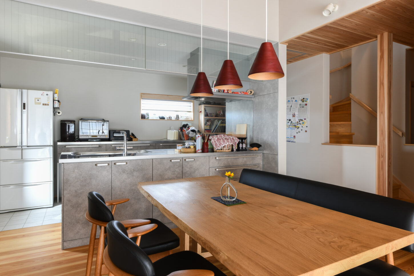 リビング・ダイニングスペースは、高い勾配天井で、吉野杉の板が張られた天井と太い梁が、空間に温かさと豊かな開放感を与えています。一方、キッチンスペースはフラット天井とすることで、機能的な作業エリアとくつろぎの空間に視覚的なメリハリをつけています。