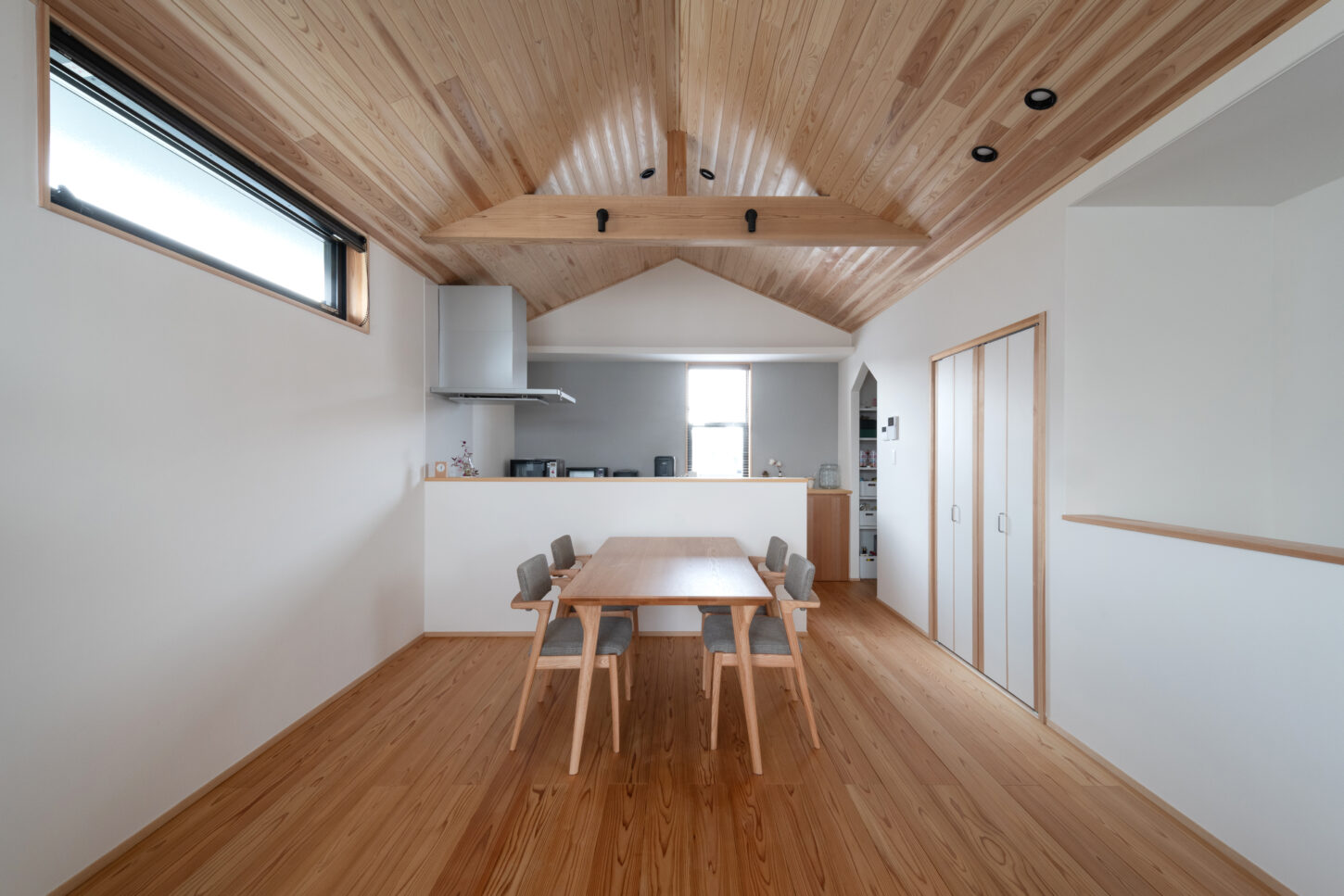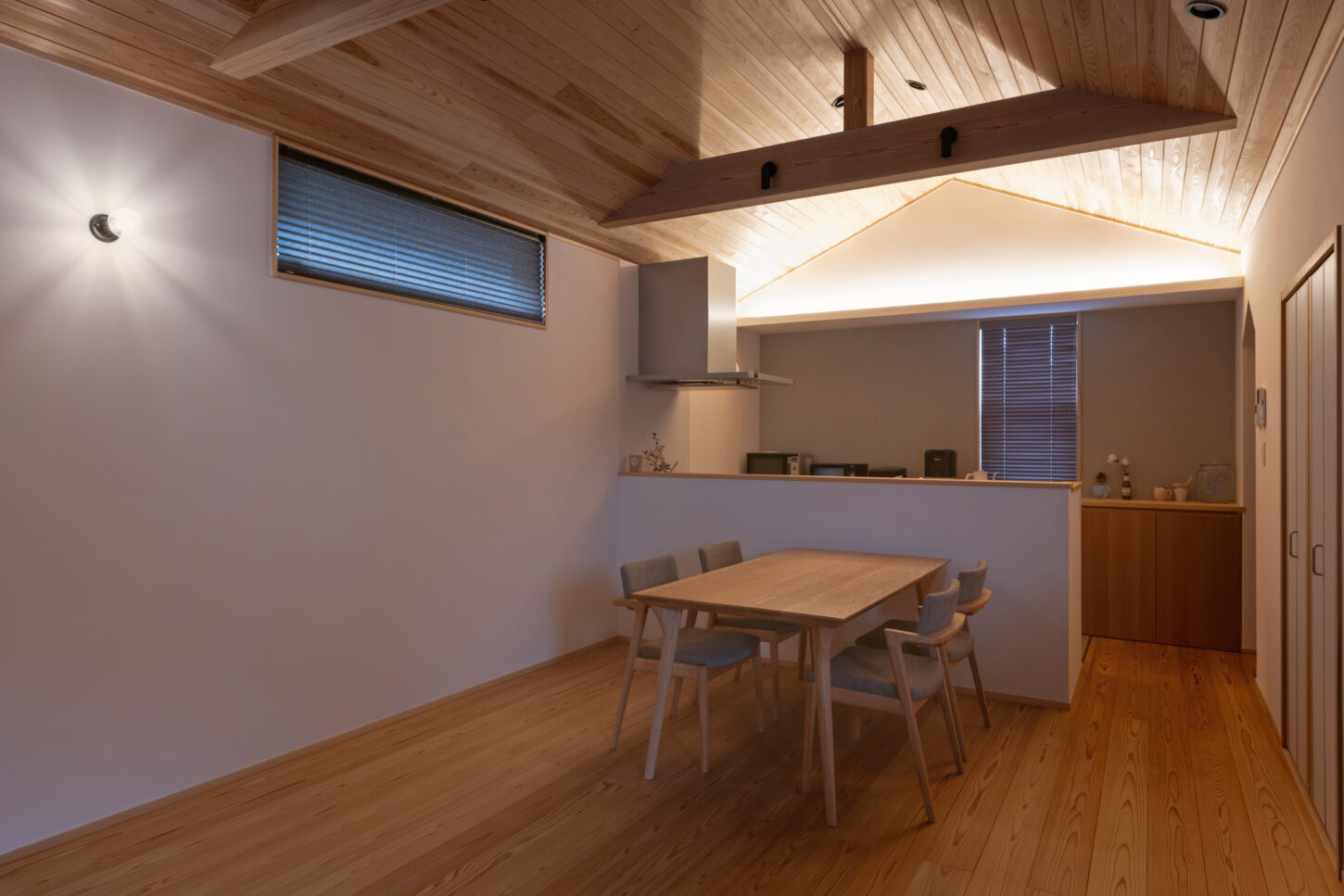 三角形に立ち上がる天井のラインが空間にリズムを生み、間接照明の光が杉板の表情を美しく引き立てます。夜には光が勾配に沿って広がり、より一層奥行きのある落ち着いた雰囲気に。構造梁をあらわしにすることで、木の力強さとデザイン性を両立しています。