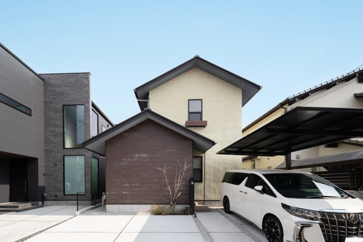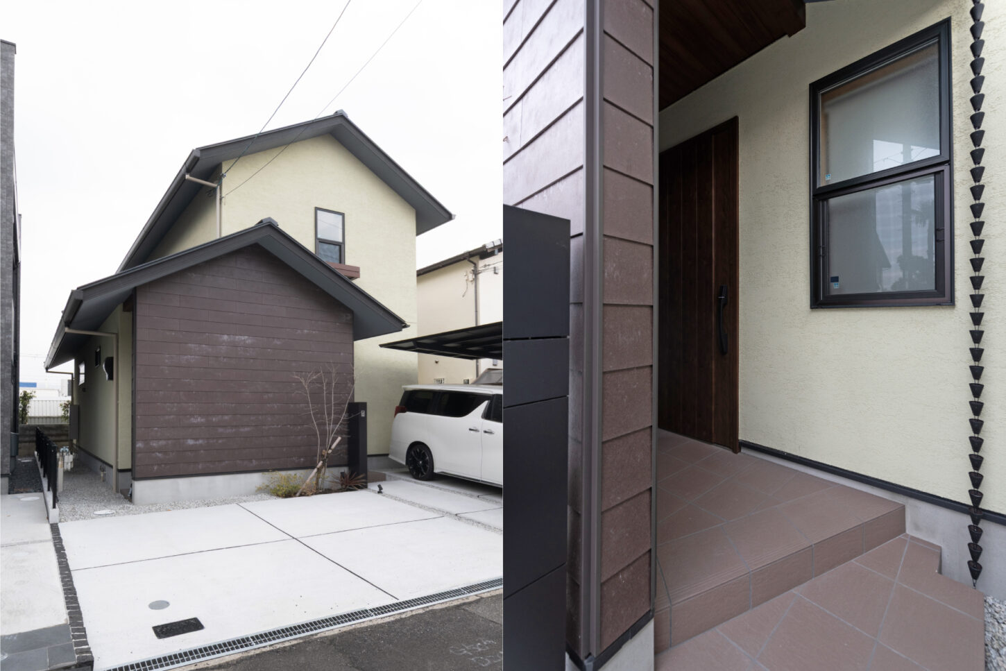 やわらかなアイボリーの塗り壁と、落ち着いたブラウンのコントラストが印象的な外観デザイン。シンプルな切妻屋根のフォルムに、素材感を活かした外壁を組み合わせることで、温もりと重厚感を兼ね備えた佇まいに仕上げました。