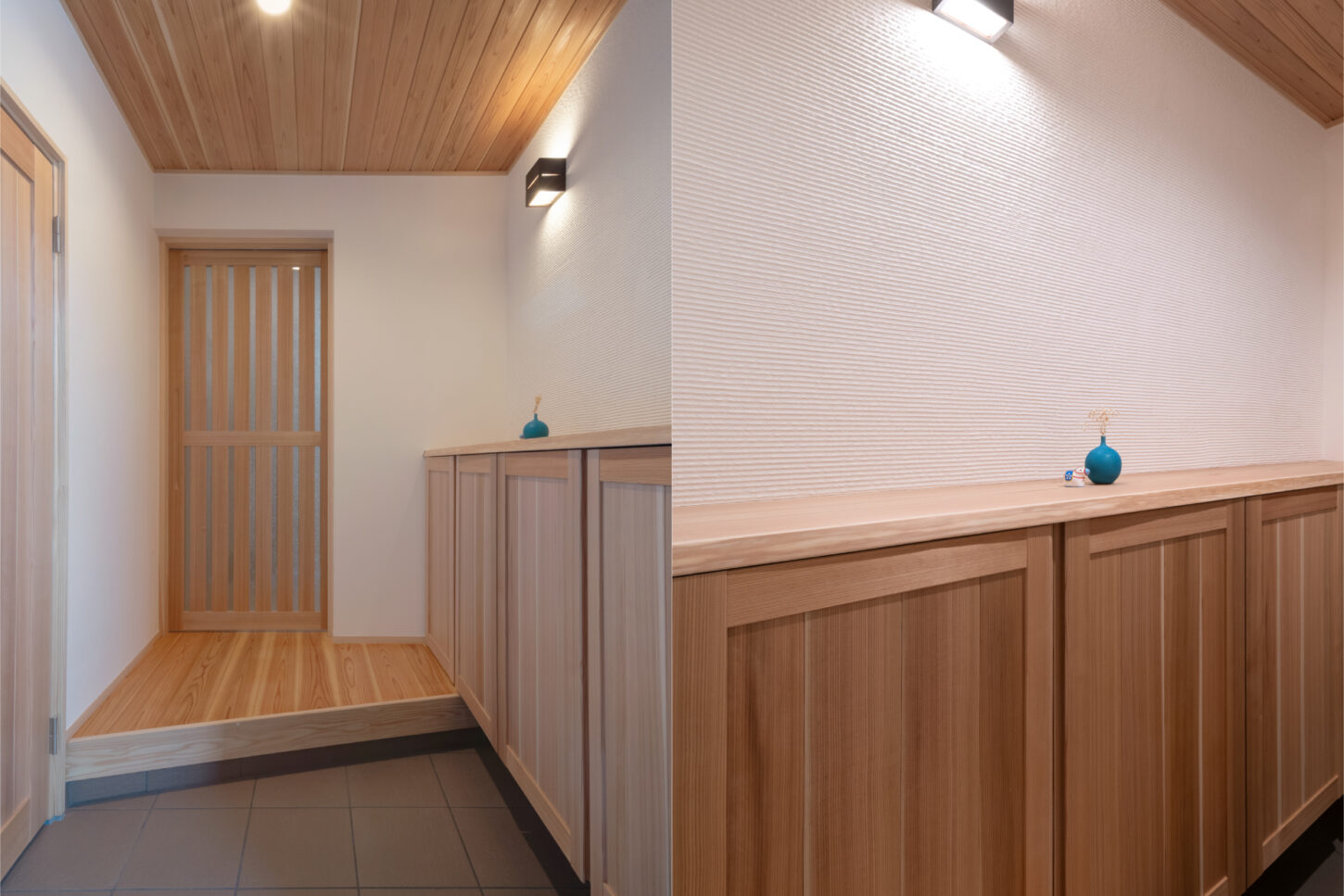 格子戸を通してやわらかく光が広がり、奥へと視線が抜ける設計。収納力を備えた造作下足入れとすっきりとした動線で、機能性と美しさを両立した玄関ホールです。