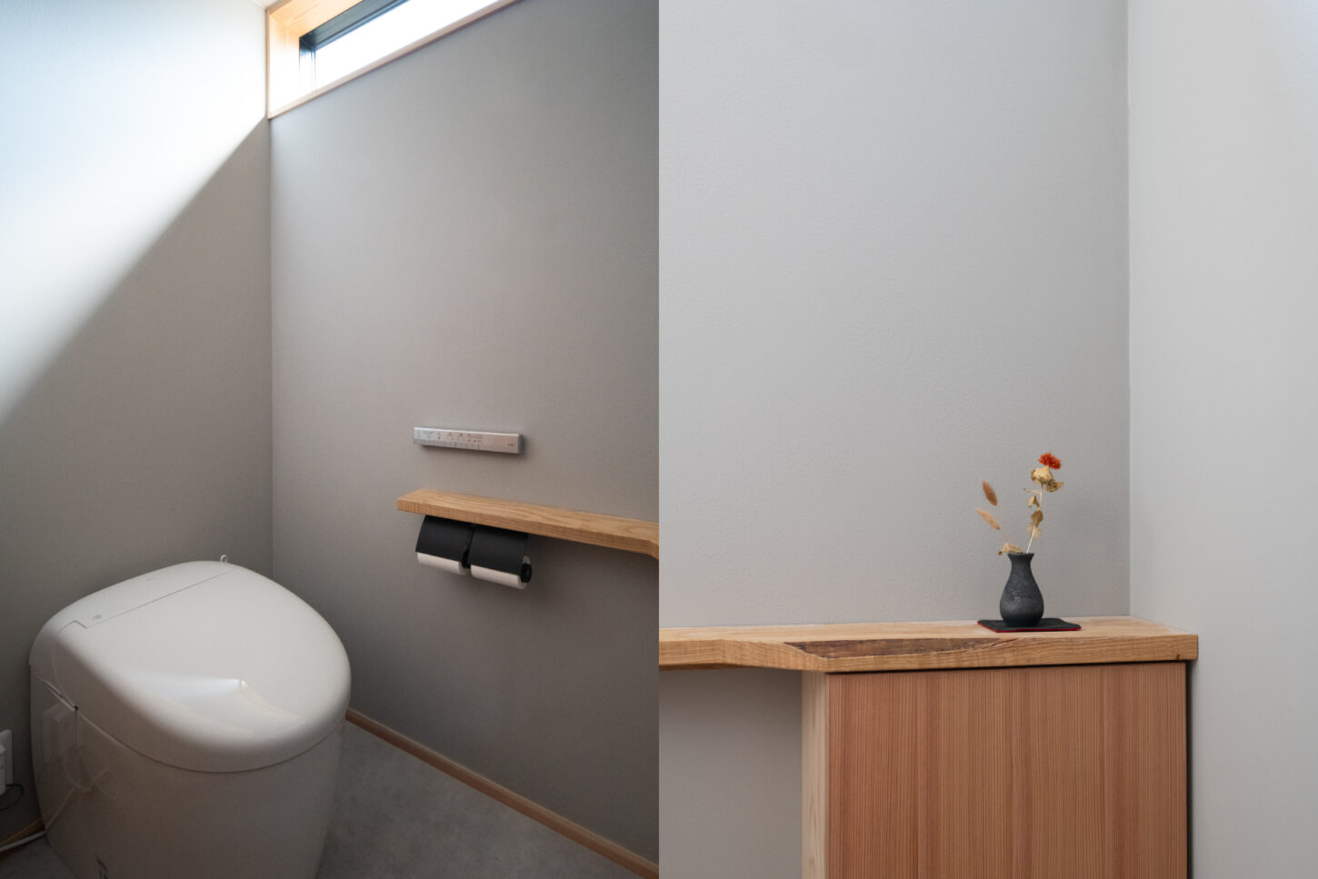 内装の多くは妻の好みを優先しましたが、唯一、私が徹底的にこだわったのがトイレの空間です。最終的には、家全体の木の雰囲気と私の好むモダンな要素が、コントラストとしてバランスよくまとまった、お気に入りの場所になりました。