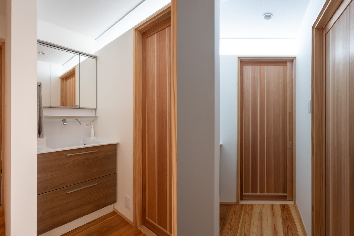 清潔感あふれる洗面スペース。床や建具にはすべて吉野杉を使用し、空間全体に統一感とあたたかみをもたらしています。造作の建具は、素材の美しさを活かしたシンプルなデザインで、住まい全体との調和を大切にしました。