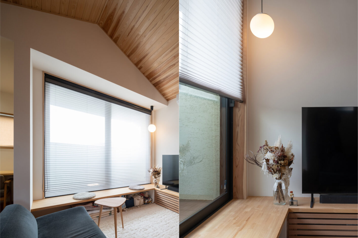 また、室内にはプロのアイデアが随所に光っています。窓の高さとフラットに揃えたL字型の造作テレビボードは、収納としてだけでなく、ちょっと腰掛けられるベンチのような役割も果たしてくれます。インテリアコーディネーターの方にご提案いただいた印象的な丸い照明も、この空間にぴったりのアクセントになりました。